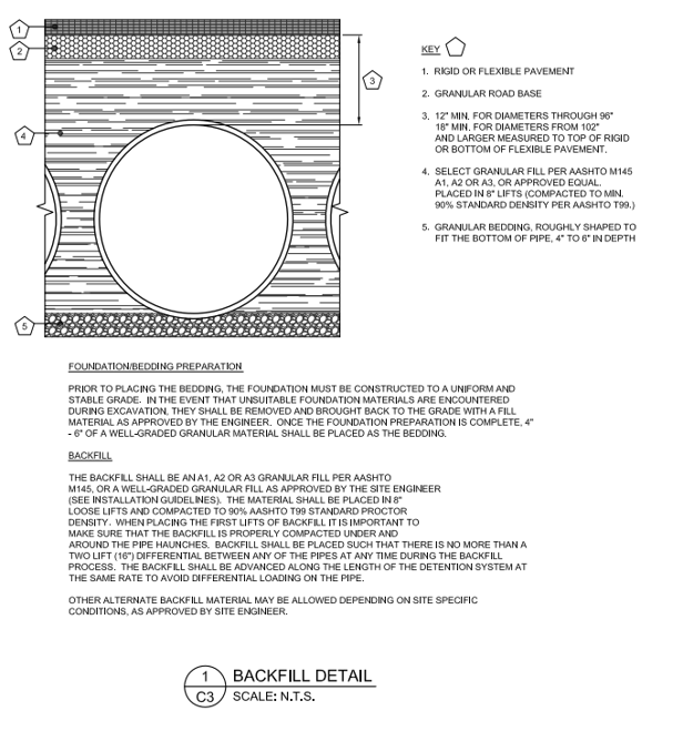The materials suitable for backfilling detention/retention systems are always stated in the backfill details (see images 1 & 2). Some systems use both pipe and stone storage, while others only use pipe storage. For systems that only use pipe storage, the backfill should be from a material that conforms with AASHTO soil classifications: A-1, A-2, or A-3 . For systems that need stone storage, the stone perimeter should use free-draining, angular, washed stone that confirms with AASHTO M 43: 3, 357, 4, 467,5, 56, 57, or an approved equal.