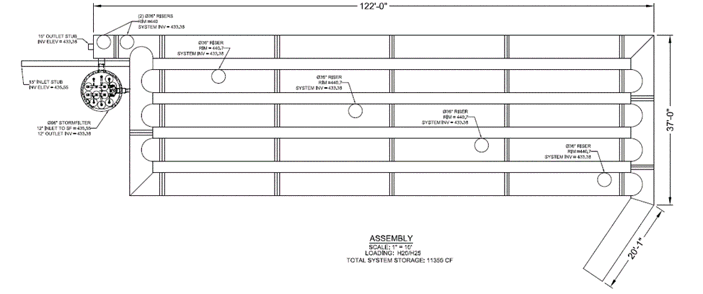 For the purpose of system inspection, it is recommended that at least one riser per run of pipe is shown over any given detention system. Risers are often staggered on systems with multiple runs (see example below). Staggering the risers is done to improve aesthetics by avoid having a series of manholes next to each other.